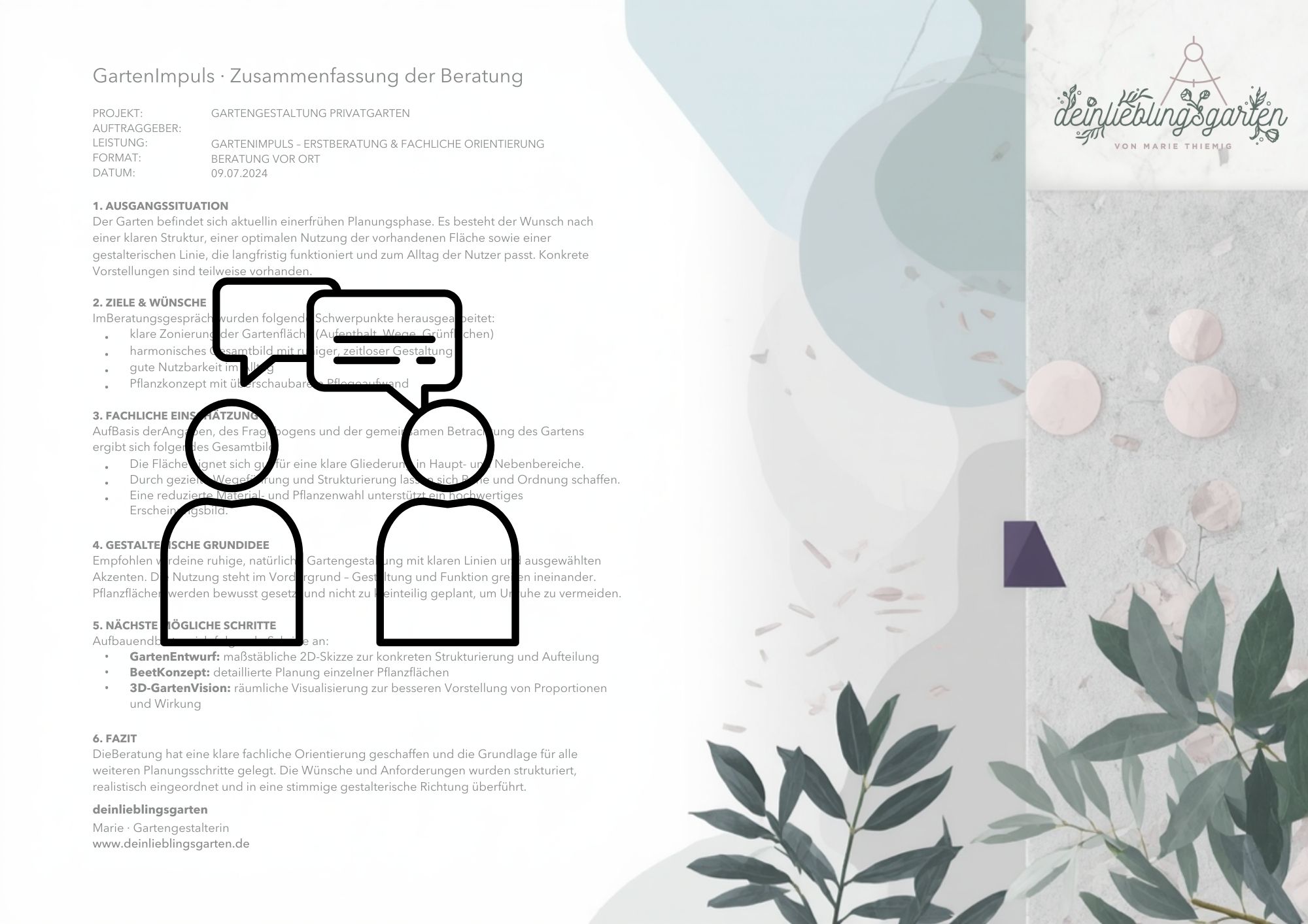 … Mit dem GartenImpuls biete ich dir eine fundierte Ersteinschätzung zu deinem Garten oder Beet. In einem persönlichen Gespräch (online oder vor Ort) erhältst du klare Ideen, eine stilistische Orientierung – danach gern kompakt zusammengefasst in einem kurzen PDF. Auch gebe ich dir ggf eine Empfehlung für weiterführende Pakete.